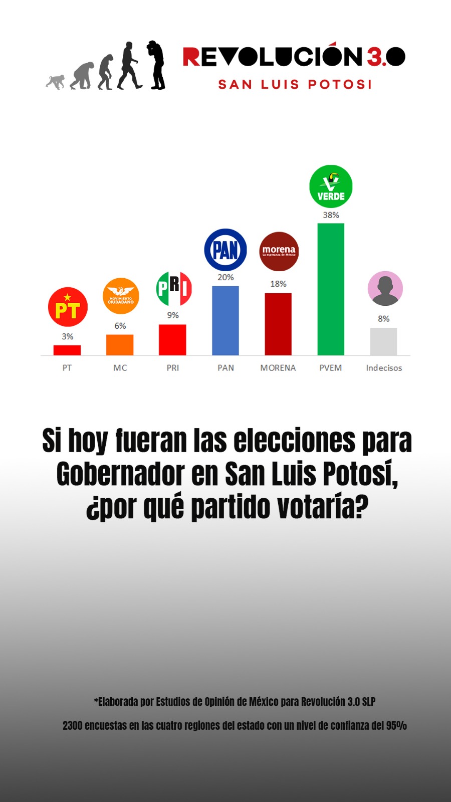 Una reciente encuesta realizada en las cuatro zonas del estado revela que, si hoy se celebraran las elecciones para gobernador en San Luis Potosí, el Partido Verde se colocaría a la cabeza de la contienda con 38% de la intención de voto, marcando una ventaja clara frente al resto de las fuerzas políticas.