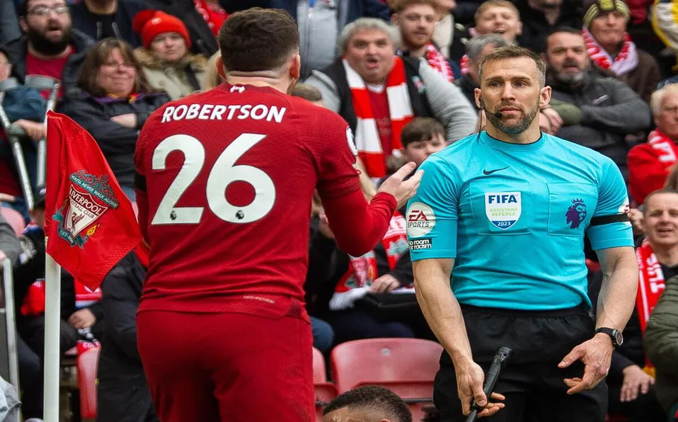 El incidente se produjo justo después de que sonara el silbato del descanso durante el empate (2-2) del Liverpool con el Arsenal el domingo. Las cámaras de Sky Sports enfocaron el enfrentamiento y mostraron a Hatzidakis levantando aparentemente el brazo y haciendo contacto con Robertson, que se quejó de que había sido golpeado por el árbitro.