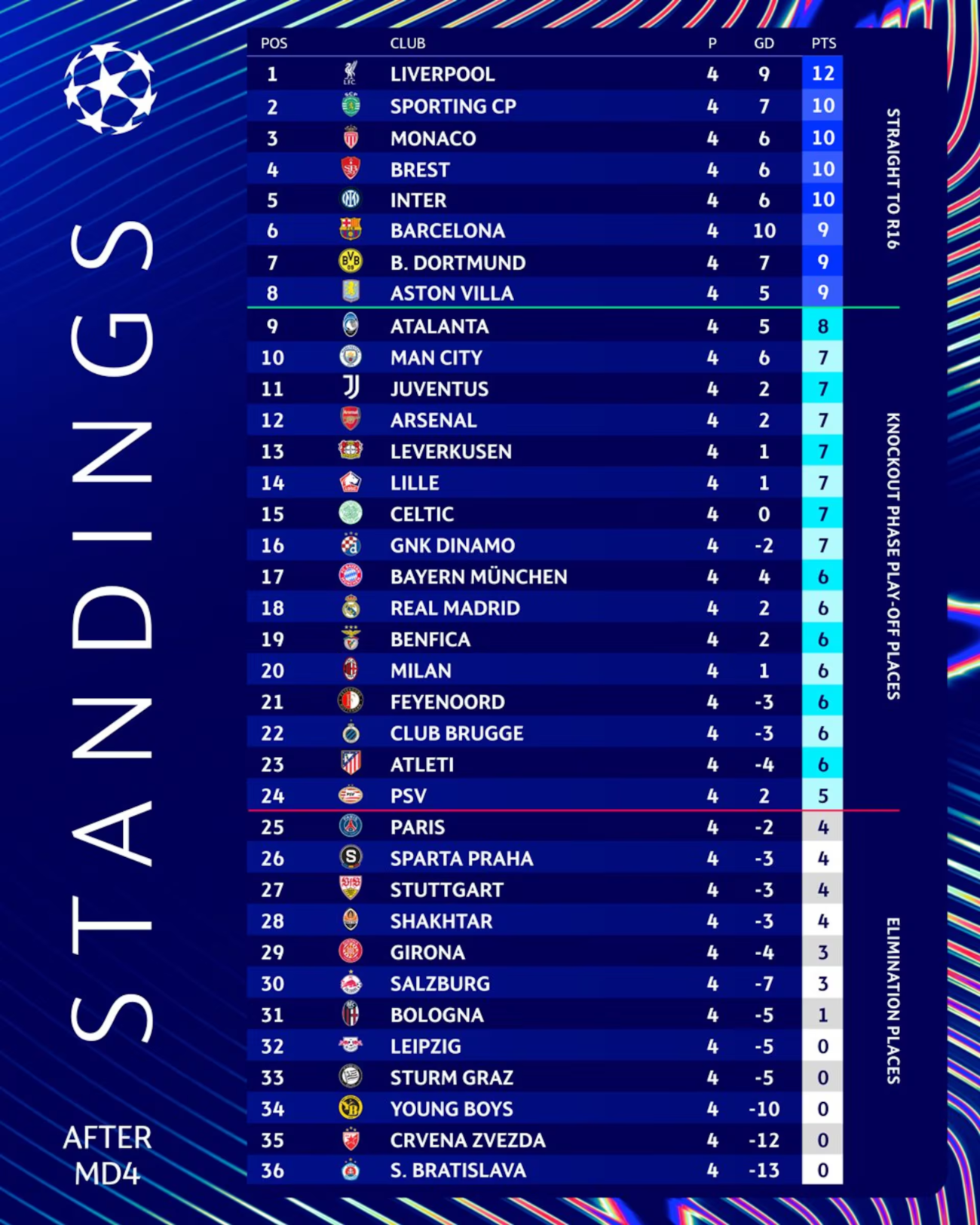 Con el nuevo formato, solo ocho equipos avanzan de manera directa a los octavos. Los siguientes 16 deberán disputar una ronda de playoffs a ida y vuelta para completar el cuadro de eliminación directa. Tras siete jornadas, únicamente Arsenal y Bayern Múnich han sellado matemáticamente su clasificación directa, lo que deja abierta una pelea cerrada por el resto de los boletos.