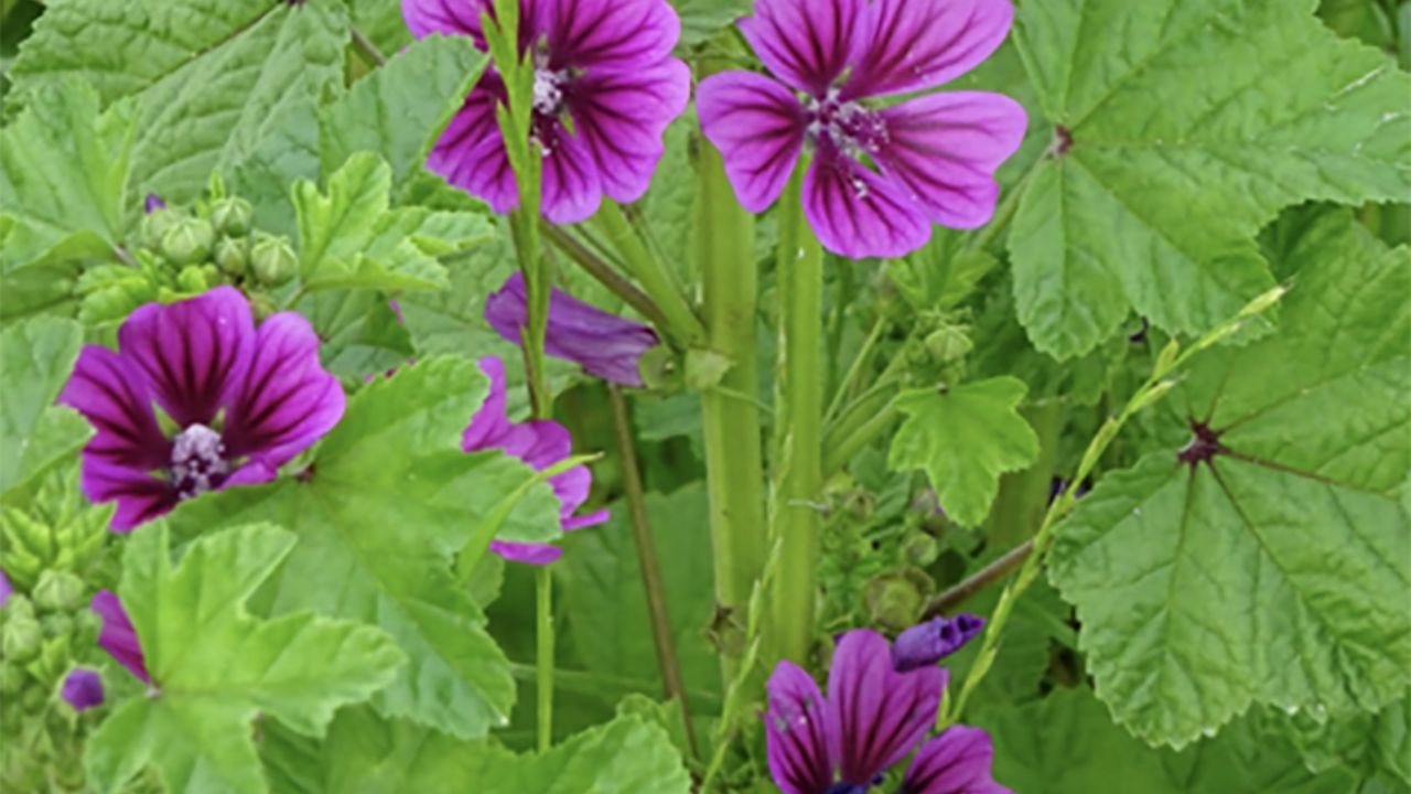 La malva es una planta rastrera o ascendente de hojas redondas, con flores de pétalos lilas o blancas que crecen en las axilas de las hojas, mientras que los frutos tienen forma de pequeños quesos y se propaga por medio de sus semillas.