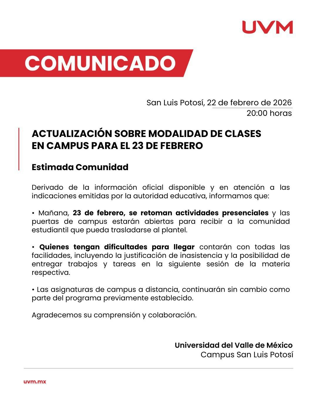 A LA COMUNIDAD EDUCATIVA DE LA UVM CAMPUS SAN LUIS, LES INFORMAMOS LO SIGUIENTE: