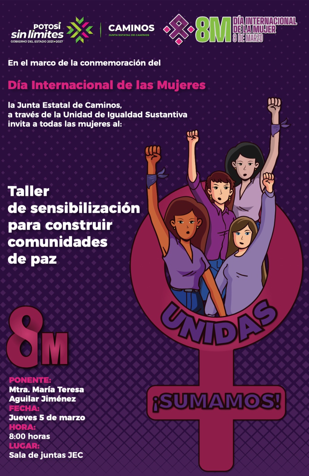 En el marco de las actividades conmemorativas por el Día Internacional de la Mujer, el gobierno que encabeza Ricardo Gallardo Cardona llevó a cabo en la Junta Estatal de Caminos (JEC) la capacitación: «Unidas Sumamos: Taller de sensibilización para construir comunidades de paz», dirigido a las mujeres trabajadoras con el objetivo de reconocerse y trabajar unidas en la configuración de espacios de respeto y colaboración.