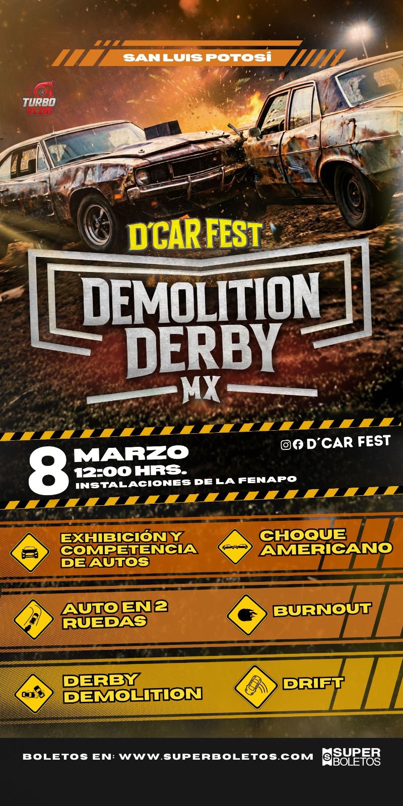 Adrenalina, motores y choques controlados serán parte del D’Car Fest Demolition Derby MX, que se llevará a cabo el próximo 8 de marzo a las 12:00 horas en las instalaciones de la Feria Nacional Potosina (Fenapo). Pilotos locales y nacionales competirán en una intensa y estratégica contienda sobre ruedas, como parte del cambio que se vive y se siente en la oferta de espectáculos innovadores impulsada por el Gobernador Ricardo Gallardo Cardona.