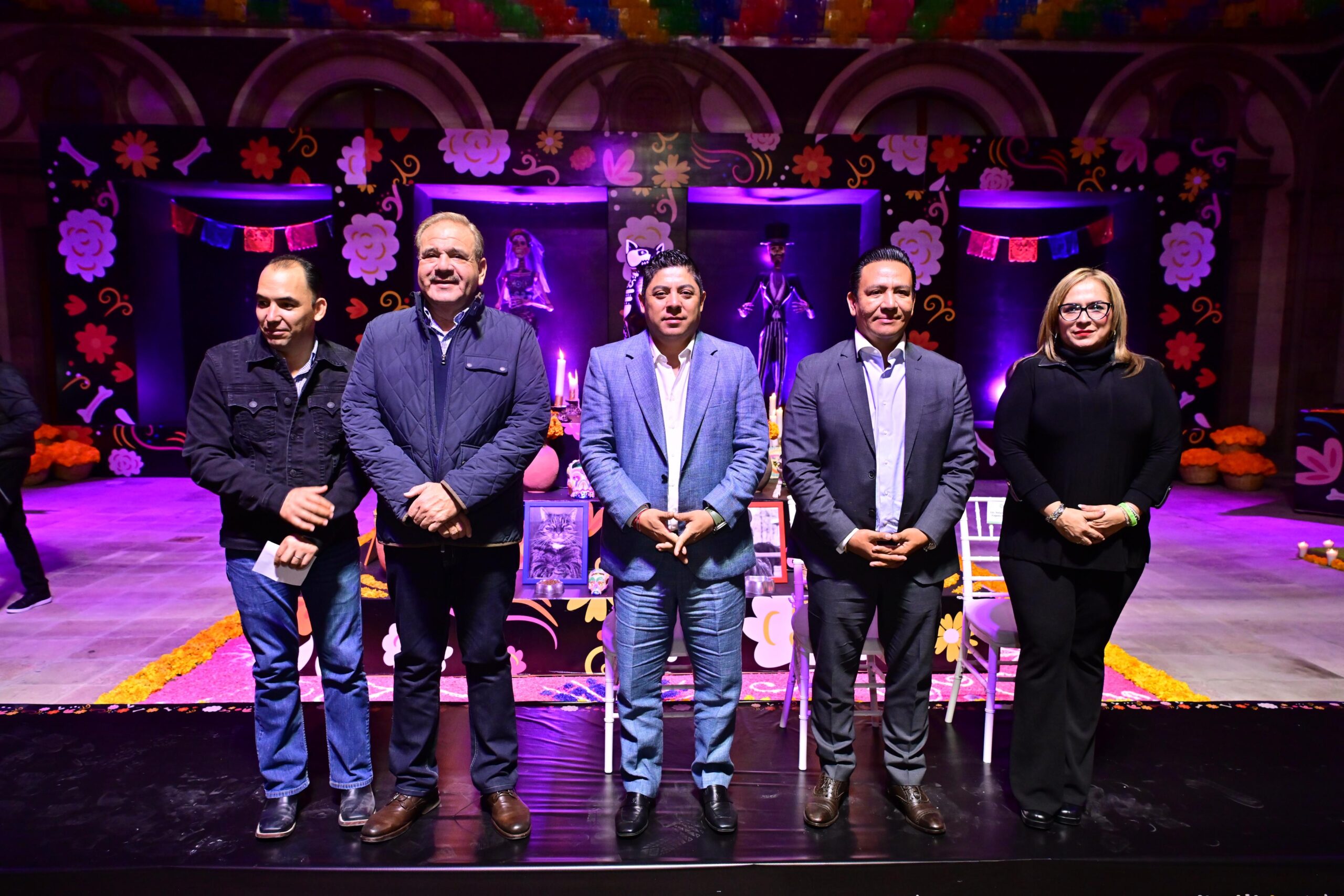• En Palacio de Gobierno, el altar cuenta con elementos de la ofrenda tradicional y mamparas para que las y los potosinos pongan la foto de sus mascotas