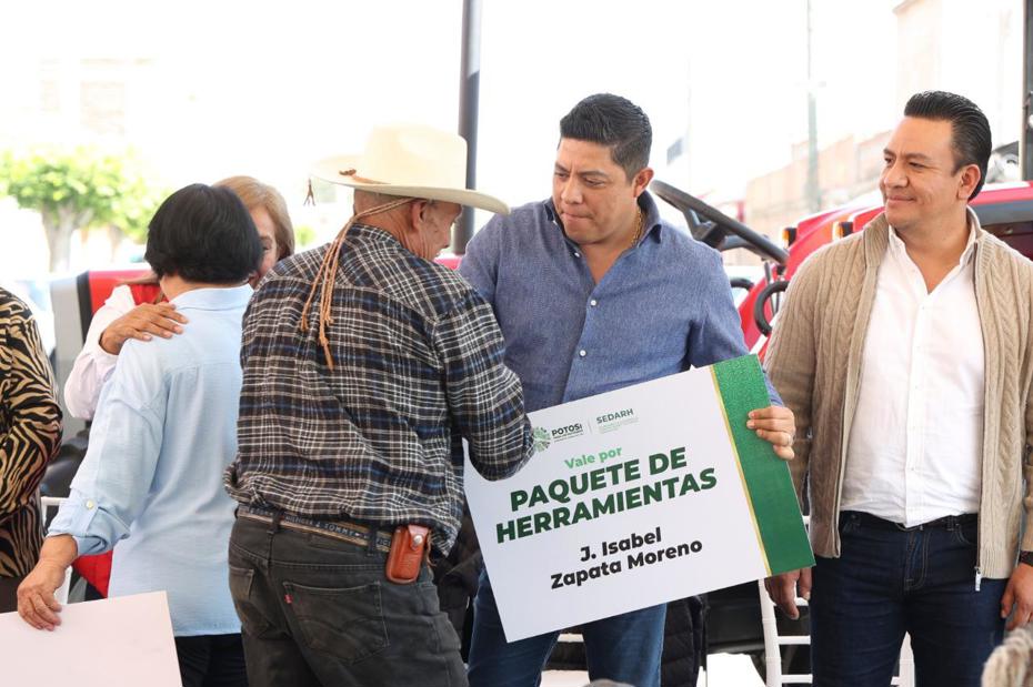 En el evento, el Mandatario potosino hizo entrega de tres tractores para Mexquitic de Carmona, para el municipio de Salinas de Hidalgo, cuatro tractores y paquetes de herramientas agrícolas para la labranza, como arados, sembradoras y aspersores, además de motobombas; para Villa de Arista entregó cinco tractores y equipo como molinos, rastras y remolques; mientras que para Soledad de Graciano Sánchez entregó tres tractores, paquetes de labranza y equipo.