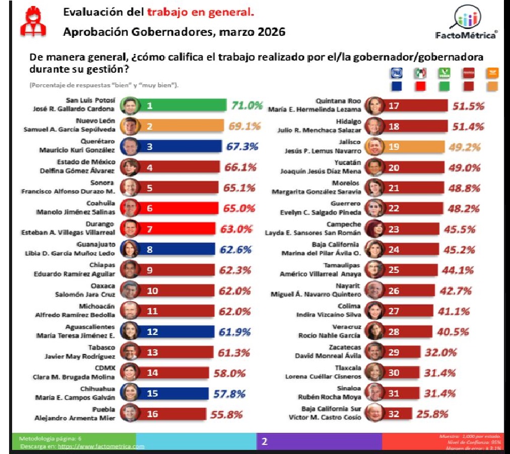 - El respaldo ciudadano impulsa al Mandatario Estatal al primer lugar nacional del ranking de FactoMétrica, reflejando resultados en seguridad, desarrollo social e infraestructura.