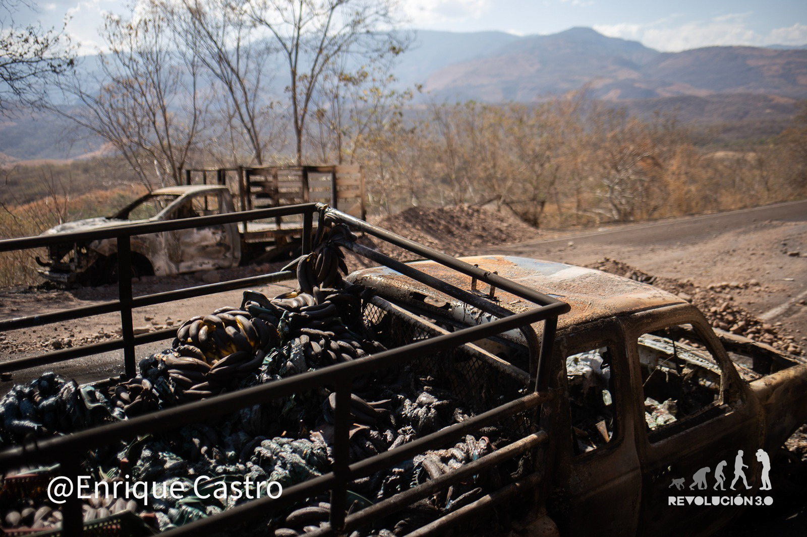 En el cruce que lleva a la comunidad de Naranjo de Chila (pueblo natal de El Mencho) un camión incinerado bloquea el paso y al asegurar la zona por la Guardia Civil, las grúas iban llegando poco a poco para retirar los restos.
