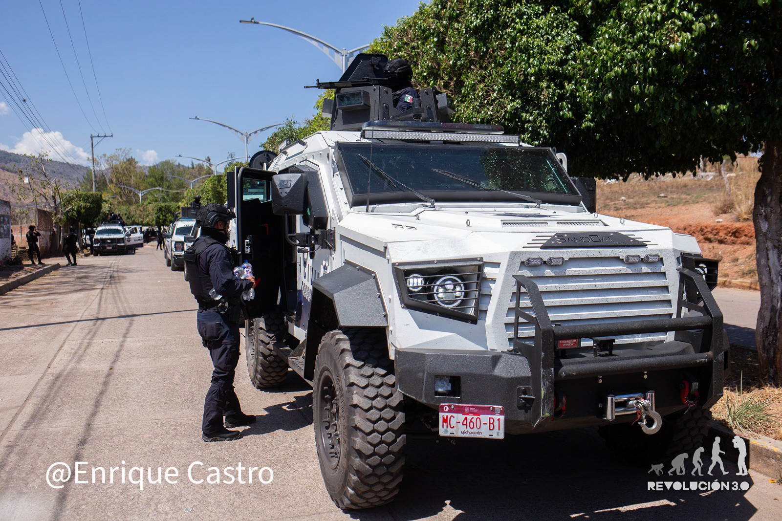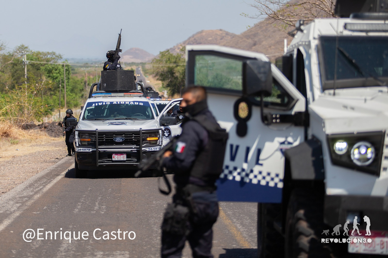 Tres convoyes distintos con más de 20 vehículos cada uno circulaban en distintos tiempos y lugares la carretera Apatzingan-Aguililla, resguardado los caminos y abriendo paso entre los bloqueos y los restos de los camiones y carros incinerados por miembros del crimen organizado en respuesta al abatimiento de Nemesio Oseguera Cervantes, alías “El Mencho” el pasado domingo.